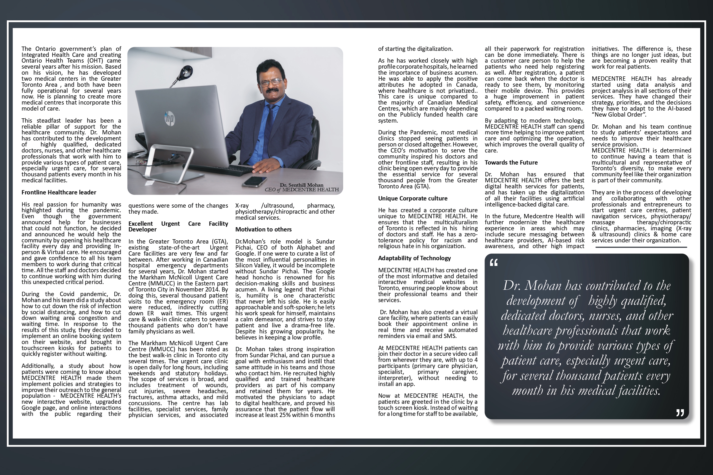 We have Digitalized Health Care Services at our clinics. Now we have an Interactive Website (medcentrehealth.com) - All the latest changes are updated instantly. It allows patient access to our care. Now our patients can Book the In-Person visit through the Website (online). Any one from any part of Ontario can get the Virtual Care (Video or Phone) from their home, working place or anywhere else through Laptop/Computer. We have Self-Registration Kiosks for walk-in patients.